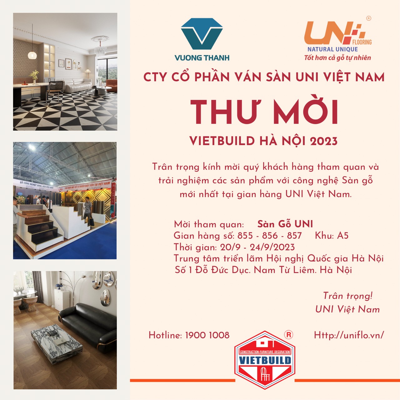 Lời đầu tiên, Công ty Cổ phần Ván Sàn UNI Việt Nam xin gửi lời cảm ơn chân thành tới các Quý khách hàng, Đại lý, Đối tác đã tin tưởng và lựa chọn sử dụng sản phẩm của Ván sàn Uni trong thời gian qua. Trân trọng kính mời Quý khách hàng, Đại lý, Đối tác tới tham quan gian hàng trưng bày sản phầm của Ván sàn Uni tại Triển lãm VietBuild Hà Nội 2023.